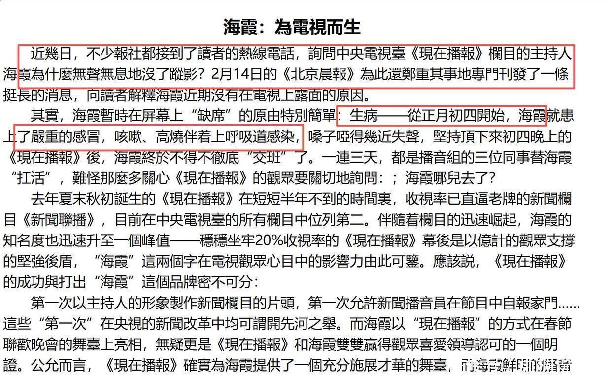 没想到只是短短的三天没见,网友们都纷纷关心起了海霞的身体状况,为此《北京晨报》还专门发表了一篇文章名为《海霞不能生病》。